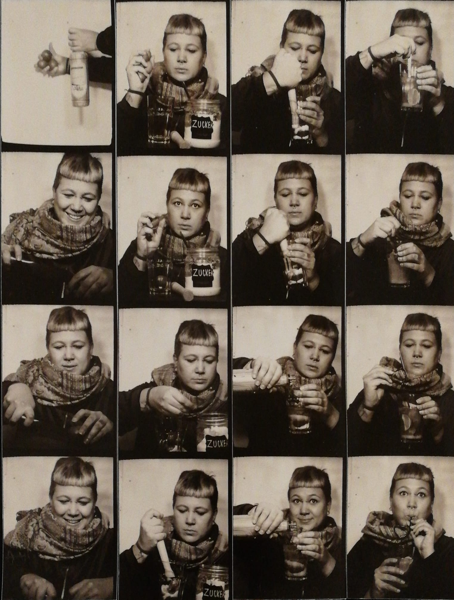 16frames stemmed from the desire to transform daily actions into performance. Over the course of 16 weeks, I committed to performing actions seen as mundane, using a street photobooth as the performative space, which also doubled as the performance registration: each performance would be recorded in 16 images.